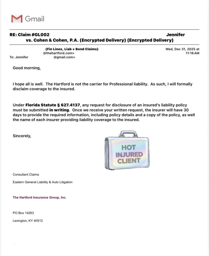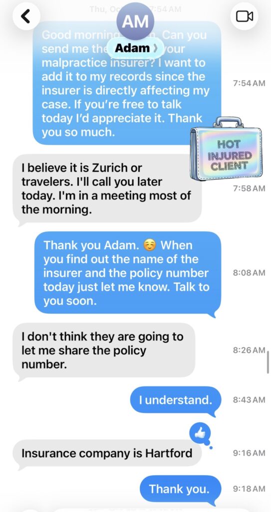 📲 He swore my case had to be dropped because of malpractice insurance risk, and then told me his malpractice insurer was The Hartford.