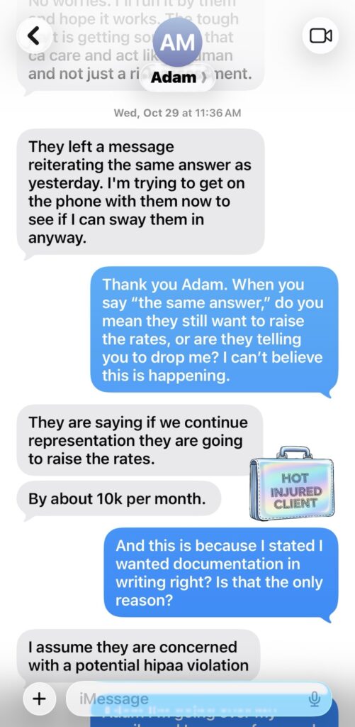 🎭 He said they’d raise his insurance $10k/month just for representing because I asked for their messages with medical staff in writing after months of miscommunications and zero case notes.