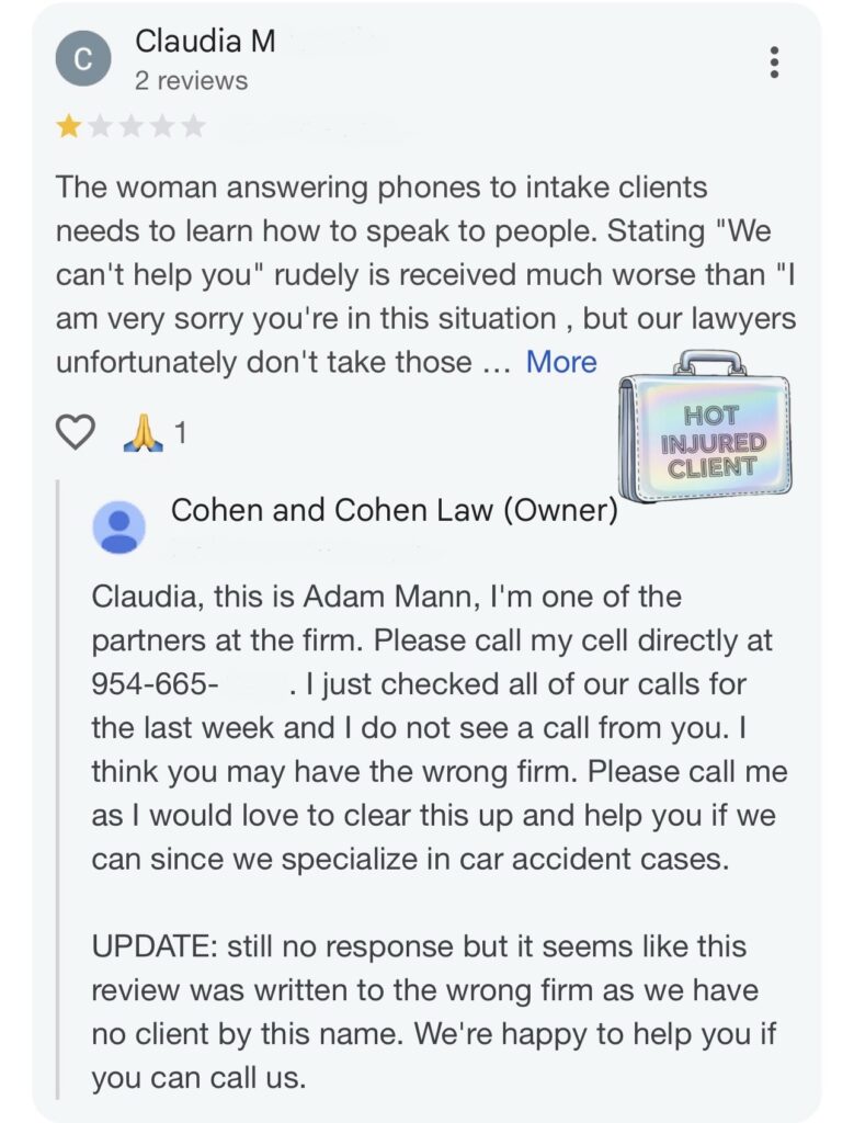 And as for the âpersonalâ phone claim? Adam used the same number to respond to Google reviews, inviting total strangers to call or text him about legal business. If itâs private, why are Google users dialing in?