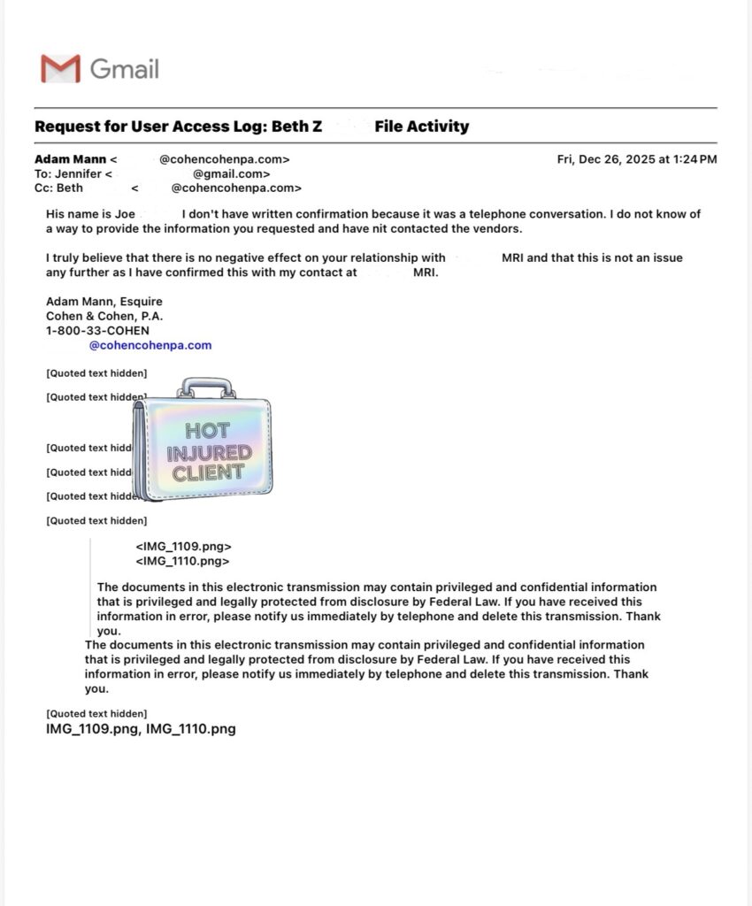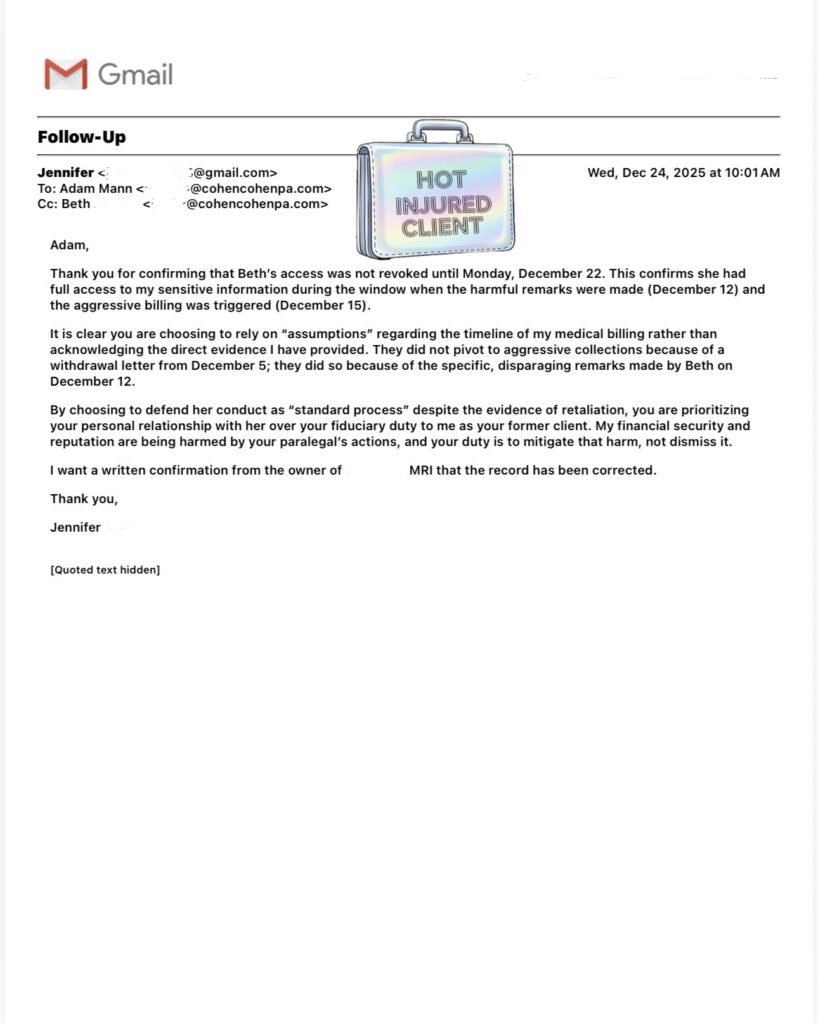 Billing Never Fixed: As of January 14, 2026, billing had not been resolved. Cohen & Cohen P.A., was still listed as attorney-of-record, and billing reverted back and forth with zero real action taken. Adam Mann never provided written proof from anyone at the MRI office with actual authority to confirm the issue was handled.