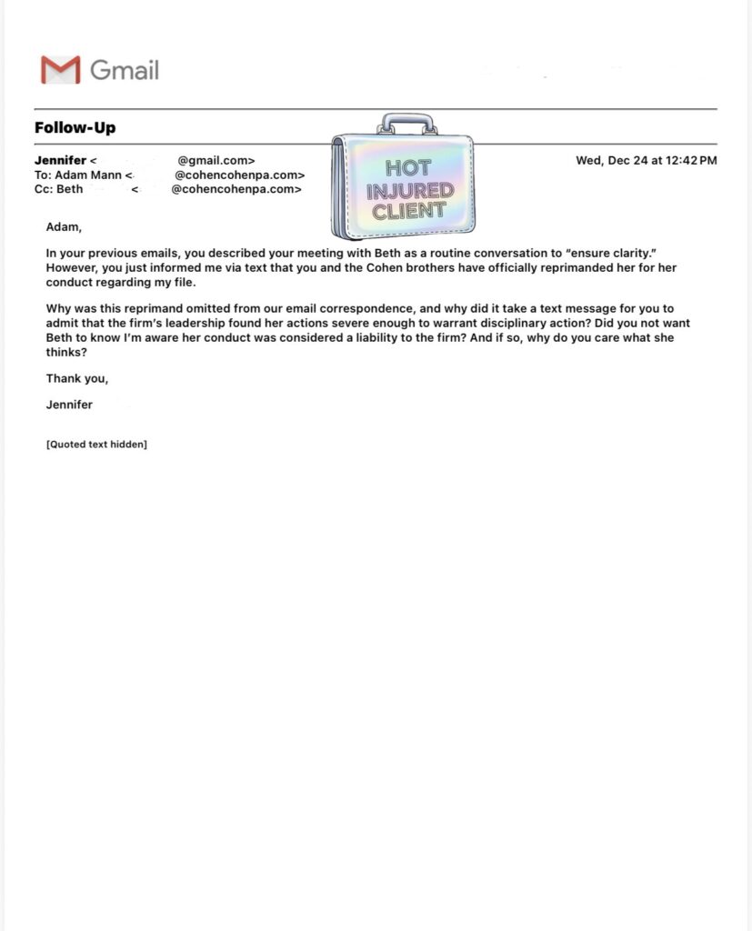 Adam told me for months that he was in âhigh-levelâ talks with his malpractice carrier (he specifically named The Hartford in texts) about my case. This wasnât an offhand comment. It was a detailed, multi-day narrative about supervisors, internal meetings with the insurer and the Cohens who âhad to be on the line too,â because my âriskyâ requests (to copy me into the communications with the medical office so I could see what was really going on with my case) were threatening to blow up the firmâs policy.