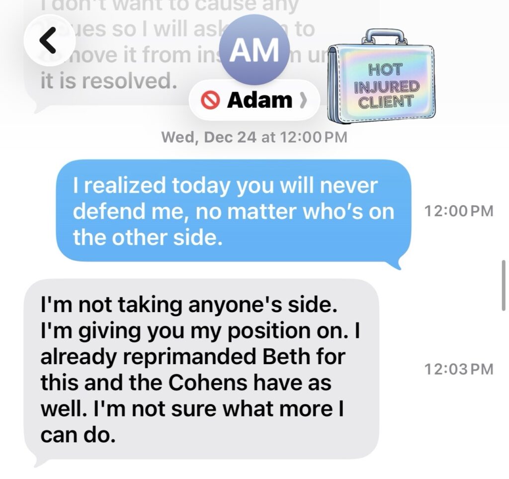 The Emotional Sucker Punch: He weaponized my injuries, my need for help, and my fear of losing legal representation. I was so panicked I actually started apologizing and trying to strategize with him on how to âsaveâ his firm from the âcrisisâ he invented (again, via text).