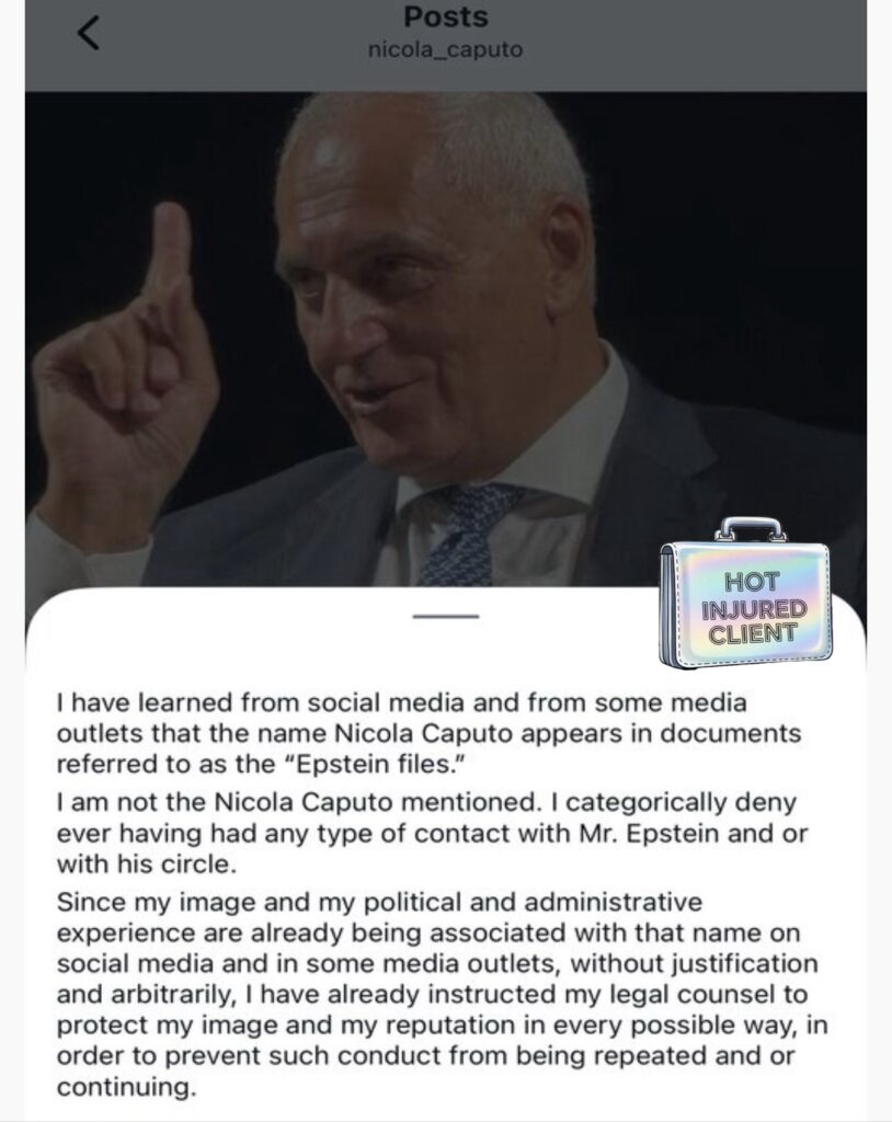 This is when you need a categorical denial. Itâs a moment when the stakes are so high your self-preservation has to be activated. And that is exactly what Italian politician Nicola Caputo has done in response to a âsimilar nameâ being released from the Jeffrey Epstein FBI files.