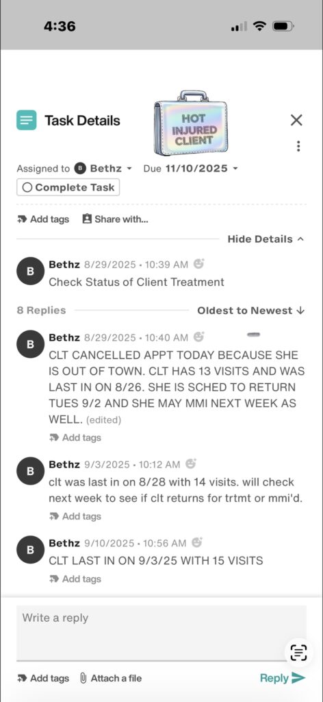 It gets darker (as most things do when there’s a rogue employee). When I pressed for the records, Adam actually sent me screenshots that proved his paralegal (and personal friend) Beth was editing these flimsy notes after the fact. Here are the absolutely sparse notes Adam Mann shared with me of all of the notes taken for multiple months: